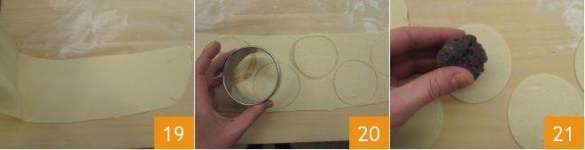 From the obtained sheet 19, cut out discs with a 3.5-inch diameter cookie cutter 20. Take a walnut-sized piece of filling and place it in the center of the dough disc 21.