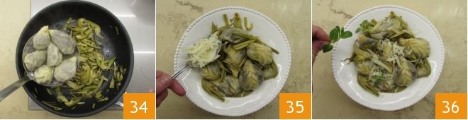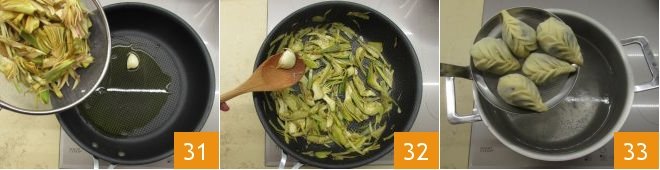 Prepare the sauté with oil and garlic in a shirt, add the drained artichokes 31, salt them, and cook them over high heat, stirring often for about 5 minutes, at the end of cooking remove the garlic clove 32. Meanwhile, bring the water to a boil and cook the culurgiones 33, no more than ten at a time.