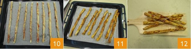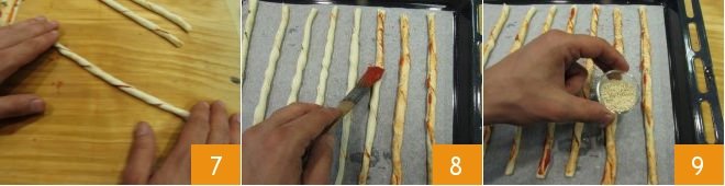 Roll the strips into spirals to form twisted breadsticks 7. Brush again with the paste 8 and sprinkle half of the breadsticks with sesame seeds 9