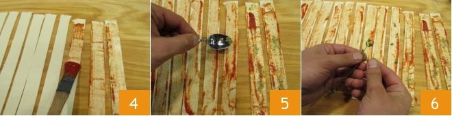Brush all the strips you've obtained with the tomato paste 4, then season half of the strips with dried oregano 5 and the other half with fresh thyme 6.