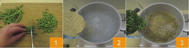 To prepare the quinoa salad, first place a pot full of water on the stove and bring it to a boil. Meanwhile, rinse the quinoa under running water; wash the green beans and trim the ends, then cut them into pieces 3/4 inch long 1. When the water boils, add salt, then add both the quinoa 2 and the green beans 3 and cook for 10 minutes over medium heat without the lid (for the cooking time of quinoa, you can follow the instructions on the package).