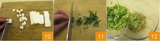 Meanwhile, cut the primo sale cheese into cubes 10 and roughly chop the mint leaves with a knife 11. Now you can assemble your salad: in a large bowl, add the quinoa and green beans, then add the zucchini 12,