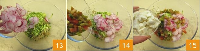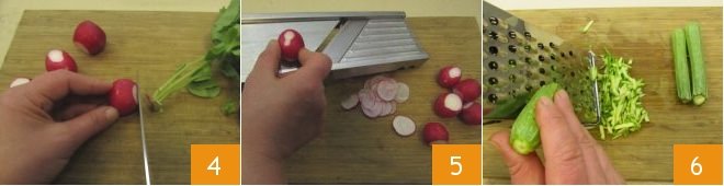 While the quinoa and green beans are cooking, wash the radishes, trim the top and bottom ends 4, and slice them very thinly using a mandoline 5 or a knife. Now wash the zucchini and grate them with a coarse grater 6,