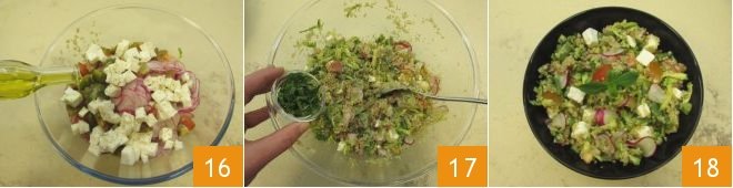 season with extra virgin olive oil 16 and adjust with salt and pepper. Stir to mix well and finally add the chopped mint leaves 17, stir again and your quinoa salad is ready to be enjoyed 18!
