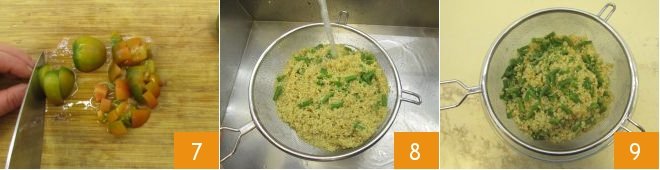 then wash the tomatoes and cut them into cubes 7. After the cooking time has elapsed, drain the quinoa and green beans in a fine-mesh sieve and rinse them briefly under cold running water to cool them and stop the cooking process 8, then place the sieve over a bowl to allow excess water to drain 9.