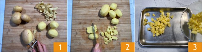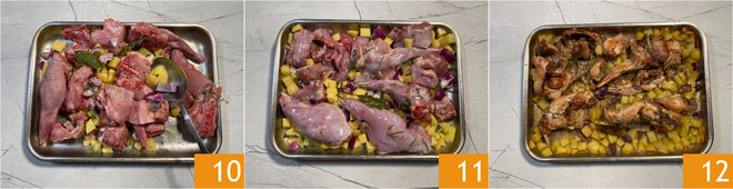 To prepare the oven roasted rabbit, start with the potatoes. Peel them 1 and cut them into irregular chunks about 1/2–3/4 inch 2. Put them in a large baking tray 3.