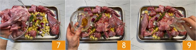 At this point add the rabbit already cut into pieces (if you notice any small bone fragments remove them) 7 and drizzle with oil 8 and white wine 9.