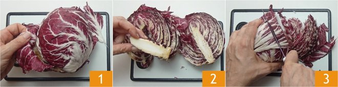 To make the radicchio in the pan, first remove the outer leaves 1, then halve the head and remove the central core 2. Finally, cut the leaves into strips 3.