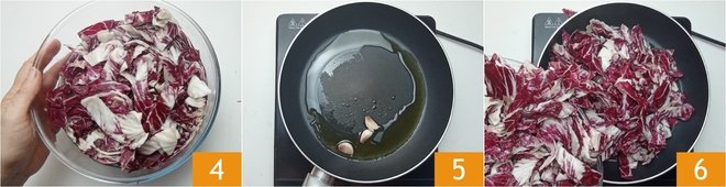 Rinse the radicchio under running water 4. If you want to reduce the bitter note, you can soak it for 30 minutes with a pinch of salt, otherwise skip this step. In a non-stick pan, sauté the unpeeled garlic cloves with the oil 5, then add the well-drained radicchio 6.