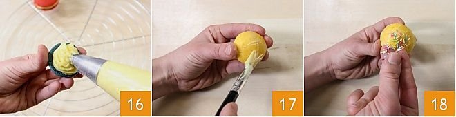 Bake the whoopie in a preheated static oven at 356°F for 13-14 minutes (if fan-assisted, 320°F for 10-12 minutes) 13. Meanwhile, prepare the pastry cream according to the instructions Pastry cream: heat the milk in a saucepan with half of a vanilla bean and its seeds; whisk the yolk and sugar in a bowl, then add the flour. With tongs, remove the bean and pour the heated milk over the mixture in a thin stream 14, blending with the whisk. Return the mixture to the heat and stir continuously until the cream thickens 15. Transfer the pastry cream to a bowl and let it cool, storing it with a sheet of cling film in contact. Remove the whoopie from the oven and let them cool on a wire rack.