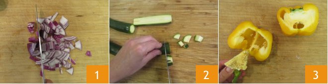 To prepare the savory tart, start with the vegetables. Wash them well. Peel the onion, slice it and coarsely chop it 1. Move on to the zucchini: trim the ends, cut it in half lengthwise and then into cubes 2. Now cut the yellow pepper in half, remove the seeds and inner membranes 3.