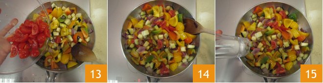 Also add the cherry tomatoes 13 and stir again 14. Season with salt 15 and pepper.