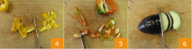 Cut it first into strips and then into pieces about 3/4 in 4. Do the same with the red pepper 5. Take an eggplant, remove the ends and slice it first 6.