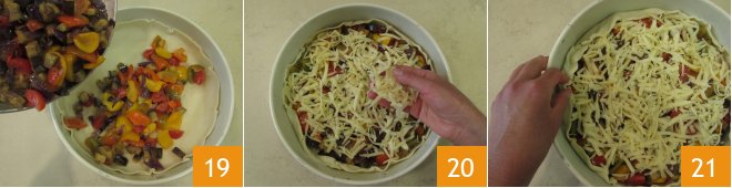 Transfer the now-cooled vegetables into the pastry 19. Add the grated Edam using the largest holes of the grater 20 and fold the excess dough at the edges inward over the filling 21.