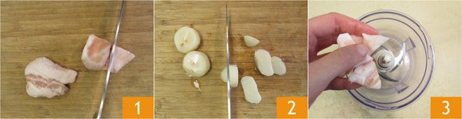 Cut the lard into pieces 1 and also the water chestnuts 2. Place everything in a food processor 3.