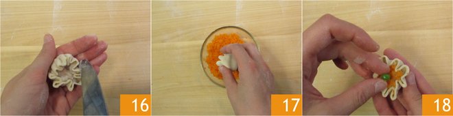 So that they resemble a flower 16. Garnish the top by dipping the top of the dumpling into a bowl of grated carrots 17. Place a pea in the center 18.