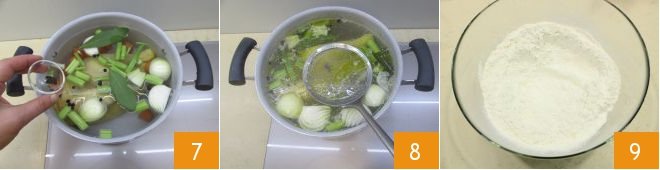 Also season with whole peppercorns 7. Cook over very low heat for about 3 hours: the capon should be tender by the end of cooking. Remember to continue skimming the broth with a skimmer 8. While the capon cooks, work on the fresh pasta: in a large bowl, pour the flour 9.