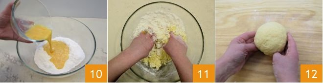 Break the room temperature eggs with a fork and pour them into the bowl 10: mix the ingredients with your hands 11, or use a fork if you prefer, until you create a homogeneous dough to shape into a ball 12. The dough should be sufficiently elastic: if it turns out too hard and difficult to work with, you can add a bit of lukewarm water; if it turns out too sticky, add more flour, but not too much to avoid the opposite effect. Wrap the obtained dough in a sheet of transparent plastic wrap and let it rest at room temperature, away from drafts, for at least 30 minutes.