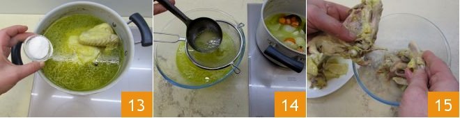 At this point, the capon will be almost cooked: ten minutes before the end of cooking, adjust the salt 13. Adding salt at the end of cooking will allow you to better gauge the saltiness of the broth. Once you've finished cooking the broth, strain it through a fine mesh strainer 14 and set aside. Take the capon and debone it 15.