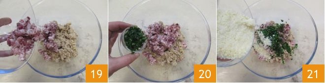 Put the blended capon and bacon in a large bowl 19, seasoning with finely chopped parsley 20. Add the grated cheese 21.