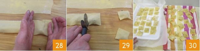 With your fingers, apply pressure between the little heaps of filling to let the air out and adhere the pasta 28. At this point, cut out the tortelli with a fluted pastry cutter 29: they should measure 1.5x1.5 inches. As you make them, place them on a tray with a clean kitchen towel lightly floured with semolina flour 30: you will get about 80 ravioli.