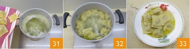 Pour the filtered broth into a pot with high sides and heat it. When it is boiling, add the ravioli 31, a few at a time to cook them: about 3 minutes will be enough 32. When they are cooked, plate your ravioli with capon broth in individual dishes and enjoy them steaming hot 33!