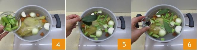 Then add the celery 4, bay leaves 5, and juniper berries 6.