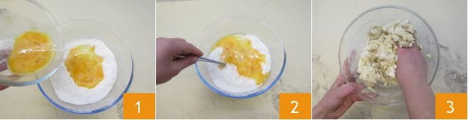To prepare the cotechino ravioli with lentil sauce, start by making the Homemade pasta (sheets and shapes): place the sifted flours in a bowl and pour the eggs 1 and a pinch of salt into the center. Then start working the ingredients by mixing with a fork 2, gradually widening to take the flour. Then start working with your hands 3 for at least 10 minutes,