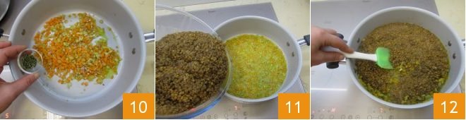 Add the rosemary as well 10 and stir with a spatula. Add the lentils 11 and cover the pot with a lid, letting it cook on low heat for about 10 minutes. Stir often to ensure they don't dry out too much 12 and