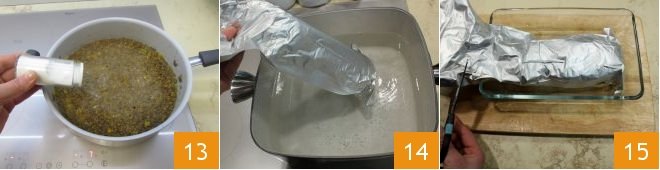 adjust the salt 13 and pepper. When ready, turn off the heat and proceed with cooking the cotechino: take a precooked cotechino and place it in a pot with cold water; turn on the heat and boil it according to the instructions on the package (it will take about 15 minutes) 14. Once the required time has passed, drain it and place it in a bowl to remove the outer casing 15, being careful not to burn yourself with the liquid in the package.