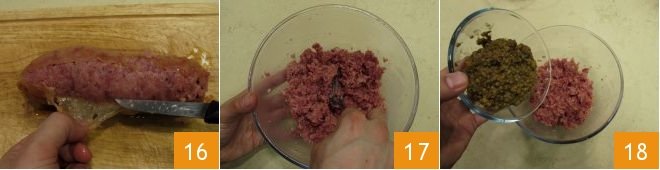 Remove the cotechino skin 16, then finely chop it with a knife in a bowl 17. Add 50 g of the lentils you prepared to the meat 18 and mix with a spatula: your filling is ready.