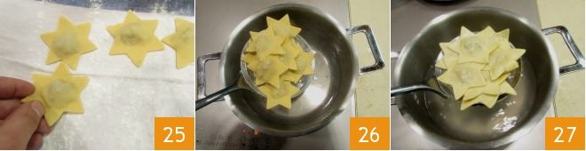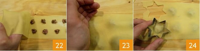 then overlap another sheet of the same size 22; press lightly to remove all the air trapped between the two sheets 23. Use a star-shaped cutter to make your ravioli 24, repeating the operation until all ingredients are used and re-kneading the scraps: with our doses, you should obtain 40 ravioli.