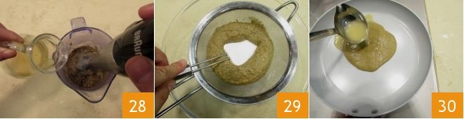 In the meantime, transfer the cooked leftover lentils into a tall-sided container. Blend with an immersion blender, gradually adding 2 oz of broth 28. When the sauce reaches the right consistency, strain it with a sieve to make it more homogeneous 29. In a non-stick pan, heat the lentil sauce together with the leftover broth 30, then