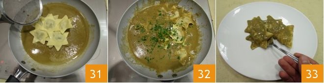 add the ravioli 31 and toss for a few seconds. At the end of cooking, turn off the heat and add the chopped parsley 32. Your cotechino ravioli with lentil sauce are ready to be enjoyed and served 33.