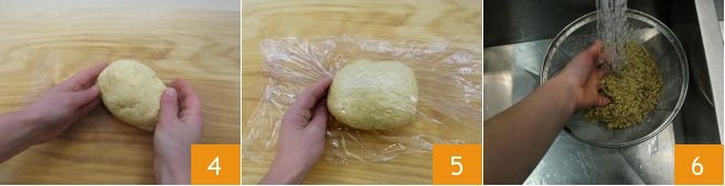 kneading and banging the dough on the pastry board until you obtain a soft and homogeneous mixture 4. Form a dough ball and wrap it with plastic wrap 5, then let it rest at room temperature for about 30 minutes. Meanwhile, continue with the sauce preparation: first, rinse the lentils under running water 6;