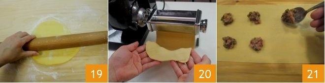At this point, take the egg pasta dough and place it on the lightly floured work surface. Roll it out with a rolling pin 19, divide it and make 8 sheets of 24x16 inches, as thin as possible, using a pasta machine 20. Place a teaspoon (about 5 g) of the filling you prepared on the sheet 21, leaving about 1-1.5 inches between each dollop of filling;