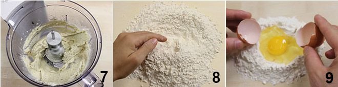 until you obtain a creamy mixture 7. If necessary, add a drizzle of oil, then adjust with salt and pepper. Set the filling aside and let it cool completely. At this point, prepare the egg pasta that you will need to form the ravioli: on a floured surface, place the flour forming the classic fountain shape 8, make a hole in the center and add the eggs. 9.