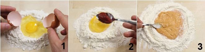 To prepare the red ravioli with tomato, place the flour on a work surface in a well, and add the eggs 1 and the tomato paste 2 in the center. Mix with the help of a fork, gradually incorporating the flour 3.