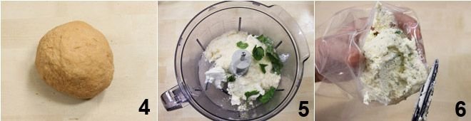 Knead the mixture with your hands until you get a smooth and elastic dough 4. Cover the pasta with plastic wrap and let it rest in the refrigerator for at least 30 minutes. Meanwhile, prepare the filling for the red ravioli with tomato: place the ricotta, grated cheese, and hand-chopped basil in a mixer 5, season with salt and pepper, and blend until the ingredients are combined. Transfer the mixture to a piping bag 6.