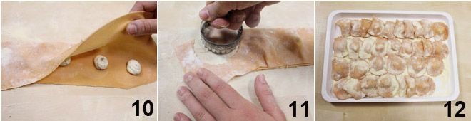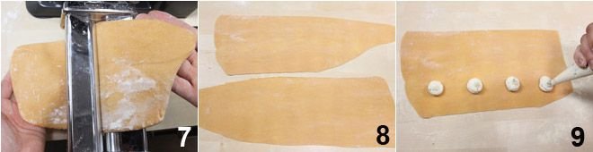 Roll out the pasta using a pasta machine 7, starting from the thickest setting, folding and turning it with each pass, until you reach the thinnest setting 8. Trim the sheets and pipe mounds of filling on one side of the sheet 9.