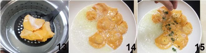 Blanch the ravioli in salted boiling water, drain them, and toss them in a pan where you have melted a pat of butter (13-14). Finish by sprinkling with chopped aromatic herbs and a pinch of black pepper, and serve hot 15.