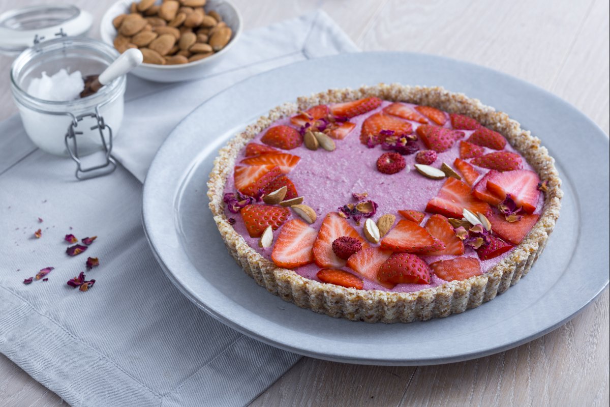 We had already talked about the no-bake tart, even though, in reality, we did use a few moments of cooking. But this time, we will tackle the matter better and guide you into the raw food world where ovens, stoves, microwaves, and any other cooking method you can think of are truly banned! Here's our colorful and flavorful raw strawberry and wild strawberry tart. Could we ever resist these delicious and fragrant spring fruits? Definitely not, and this fresh strawberry tart without cooking is the proof! Although, to be honest, both the cream and the base can be easily adapted according to your tastes and even the seasonality. So discover with us the recipe for the raw strawberry tart and let us know what you think!