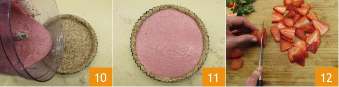 Pour the mixture onto the base 10 and spread it carefully, placing it in the refrigerator to set for at least 4 hours 11. When the dessert has firmed up, move on to decoration. Clean the strawberries and slice them 12.