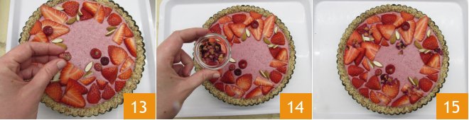 Then add the wild strawberries and halved skin-on almonds 13, garnish with a few dried rose petals 14, and your raw strawberry tart is ready 15.