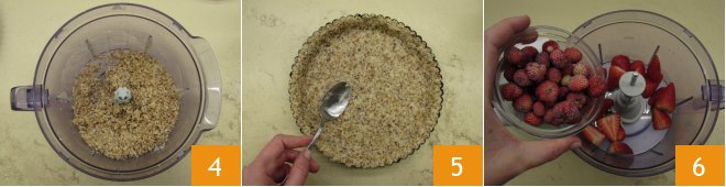 To prepare the raw strawberry tart, start with the base, you will need to soak the cashews overnight to degrease them and make them more digestible 1. After the time has passed, blend almonds, pitted dates 2, shredded coconut, and almond butter 3 in a mixer.