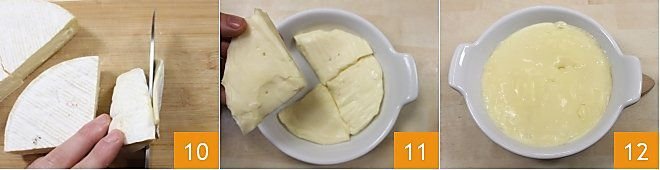 Now prepare the Reblochon fondue: cut the cheese into 4 large slices, remove the outer crust from each slice 10, place the slices in a round terrine (ceramic or terracotta) that can hold the Reblochon form, which measures about 5-5.5 inches (13-14 cm) in diameter and 1.4 inches (3.5 cm) thick 11. Bake the terrine in a preheated oven at 392°F (200°C) for about 25/30 minutes, the fondue will be ready when the cheese is completely melted 12. Serve the Reblochon fondue hot with the roasted potatoes, and if you like, you can also accompany the dish with a platter of cold cuts.