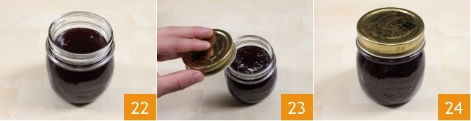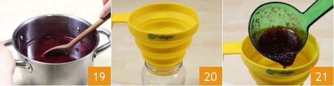 fill the container, making sure to leave 0.4 inches (1 cm) from the rim 22, then with suitable lids, close them 23, tightening well and ensuring they are hermetically sealed. With the heat from the jam, a vacuum will be created, allowing the product to be stored for a long time. Once the jars have cooled down, check if the vacuum has been correctly formed: you can press the center of the lid and, if you don't hear the classic "click-clack", the vacuum has been formed. Your red currant and blueberry jam is ready 24.