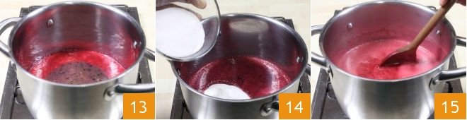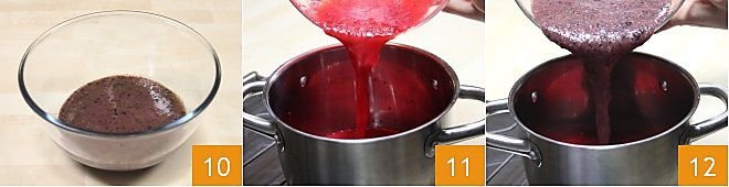 to obtain the juice and pulp of the blueberries 10. In a tall and large stainless steel pot, pour first the currant pulp 11 and then the blueberry pulp 12.