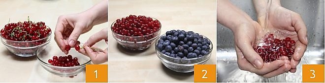 To prepare the red currant and blueberry jam, start by gently removing the currants from the stems and place them in a small bowl 1. Also prepare a small bowl for the blueberries 2. Wash the currants well under running water first 3 and then
