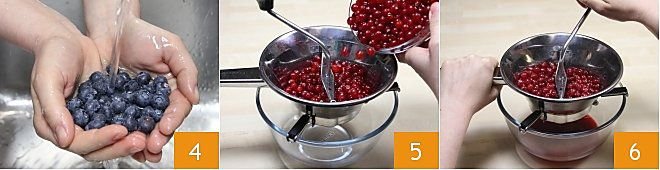 the blueberries 4. Get a food mill with large holes and place it over a large bowl to collect the fruit juice; pour the currants into the food mill 5 and pass them through several times, turning gently 6,